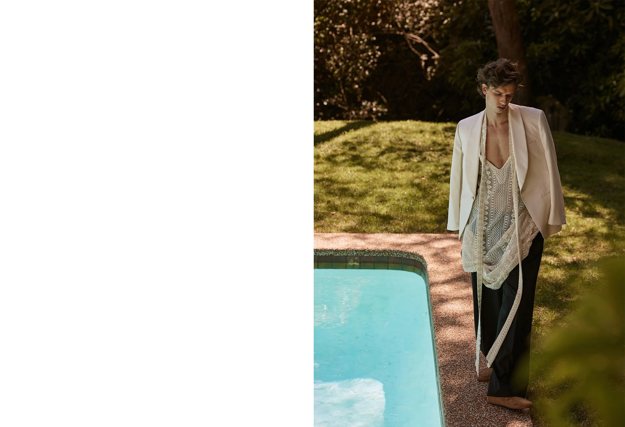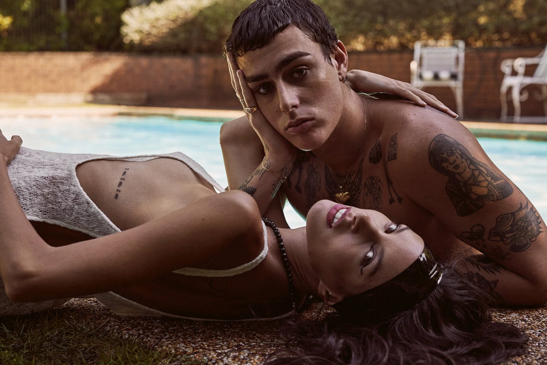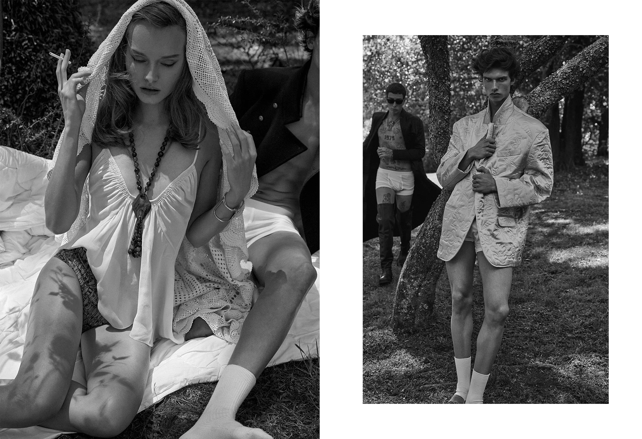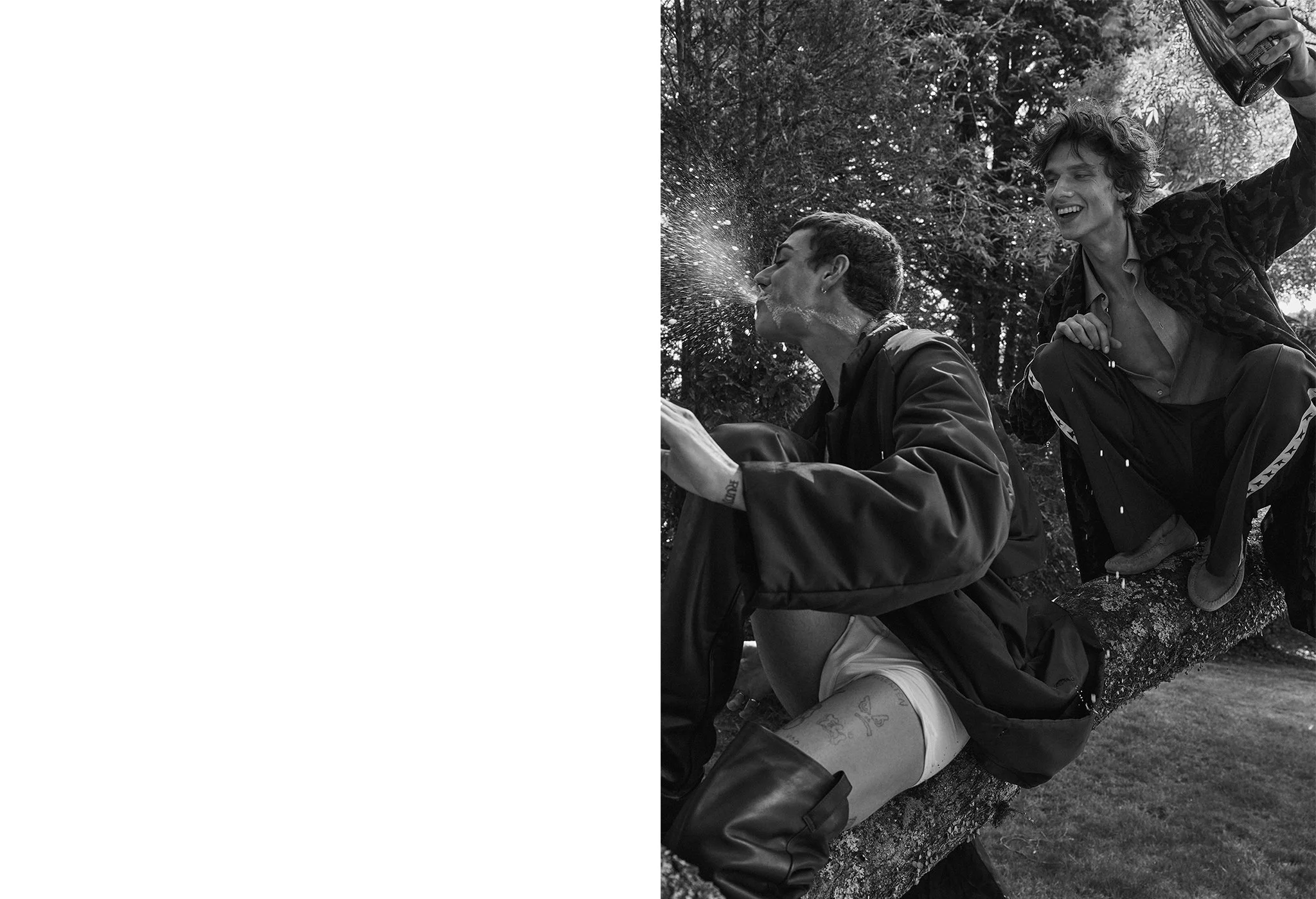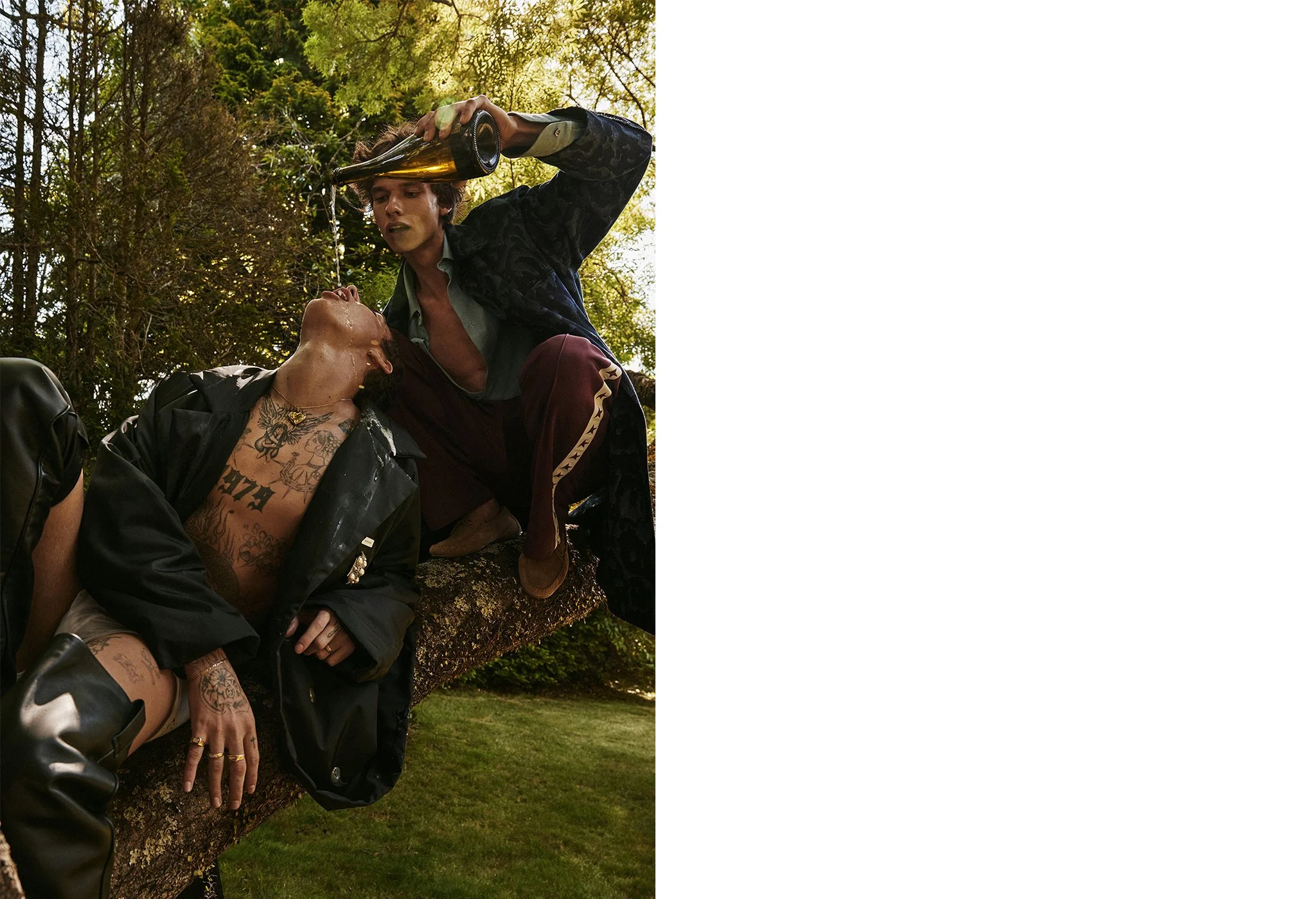 Aria: Celine top and cuff, Common Hours briefs, vintage necklace. Declan: Emporio Armani jacket, underwear and socks, stylist own. Declan: Albus Lumen jacket, Meadowlark earring. Noa: Albus Lumen coat, Steven Miesel x Zara boots, Oliver Peoples sunglasses