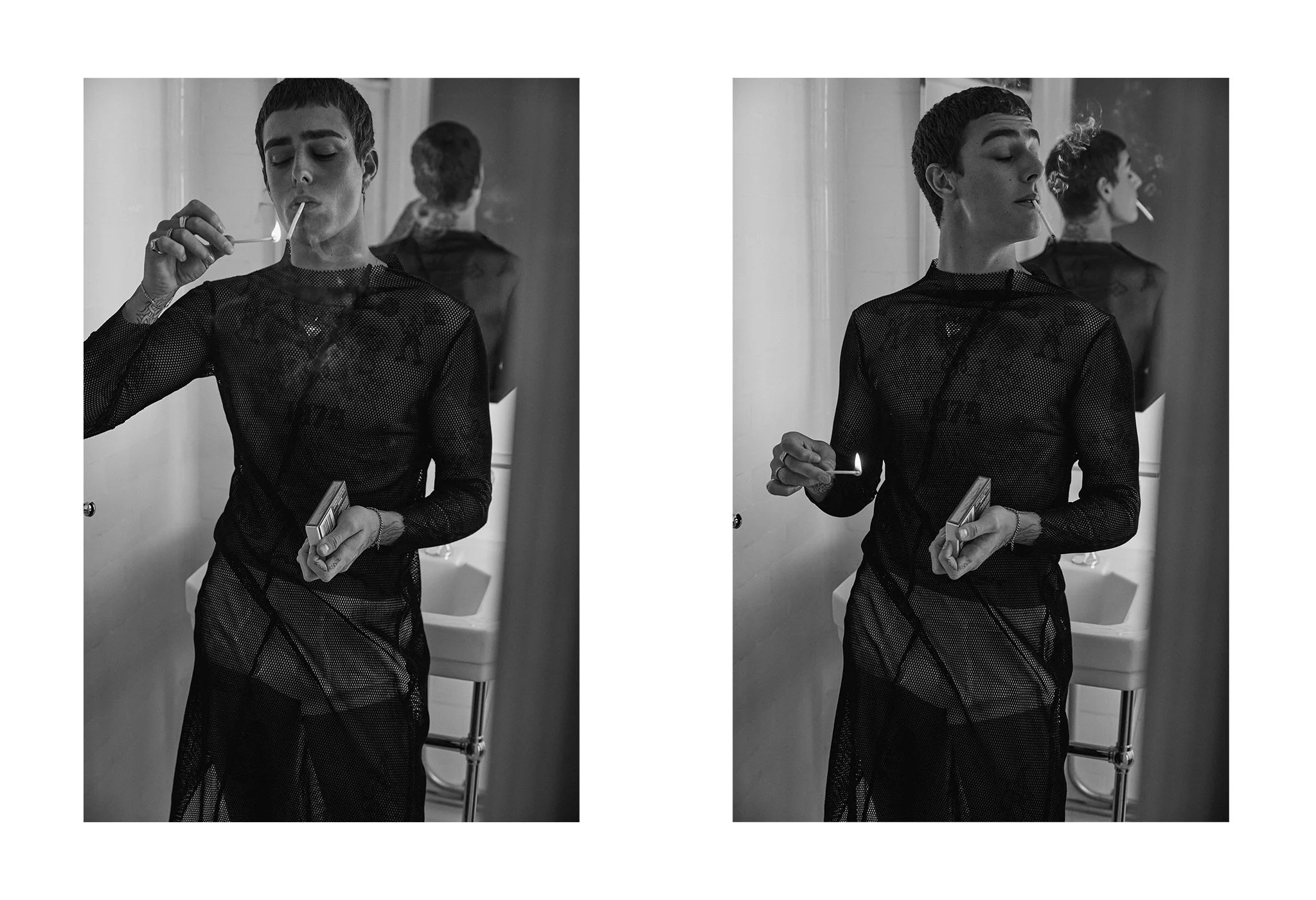 Noa: Michael Lo Sordo mesh top, pants, Fendi shoes. Noa’s own jewellery throughout. Aria: Celine jacket, Common Hours gown. Kate: Common Hours robe, Celine boots, vintage necklaces courtesy of Izabella Zaczkiewicz. Declan: Emporio Armani jacket, Haulier denim, Zara loafer