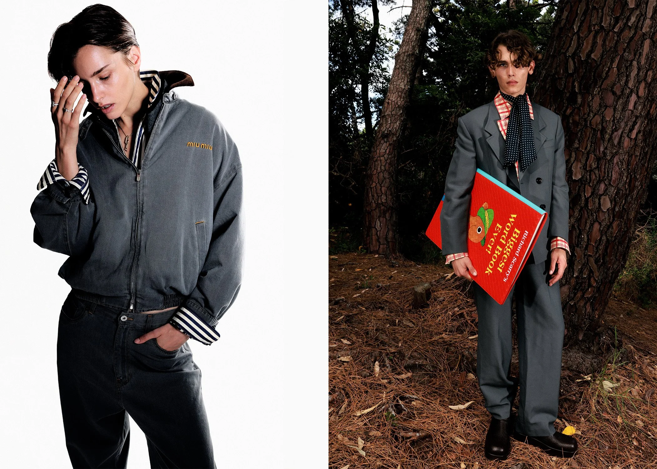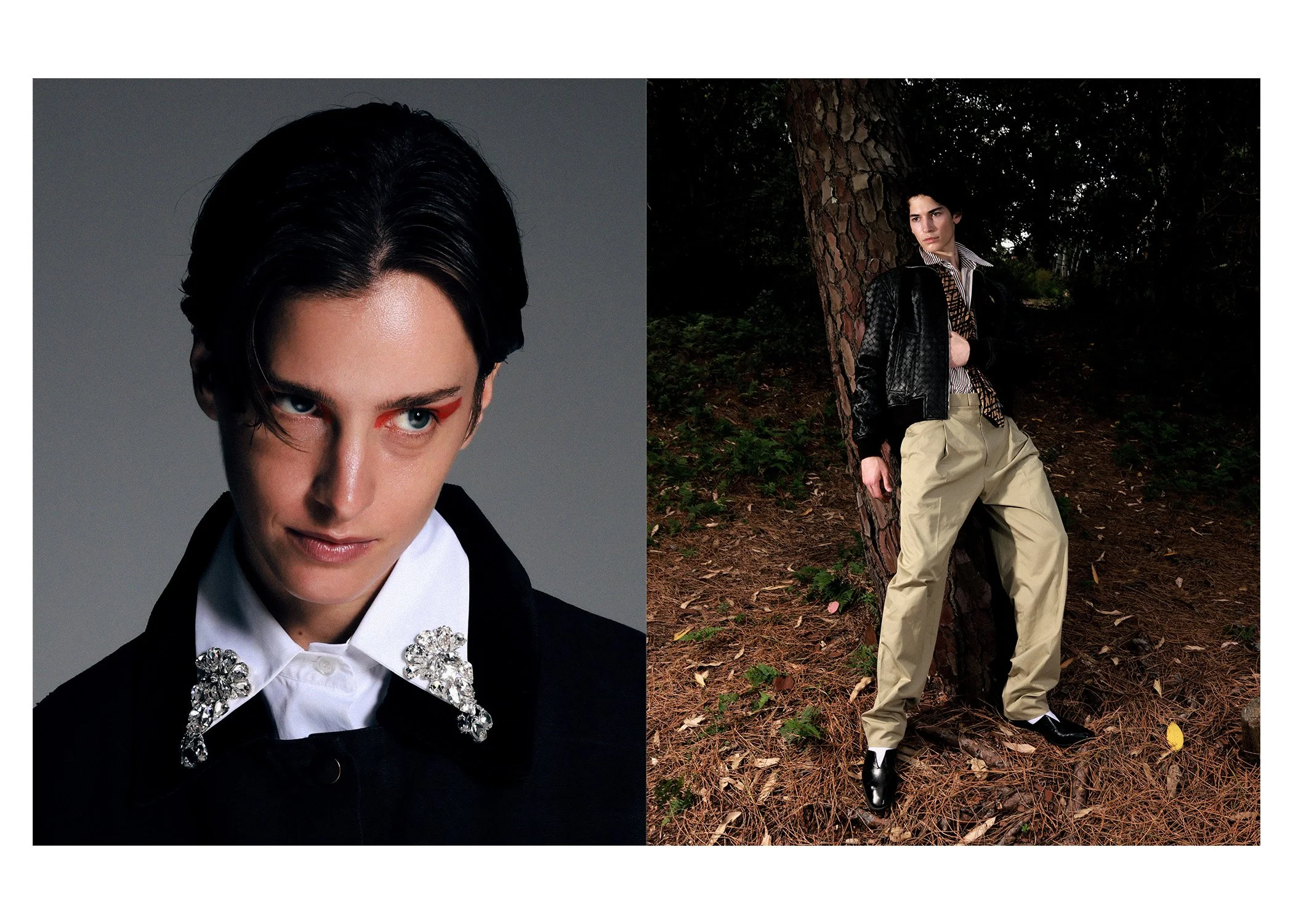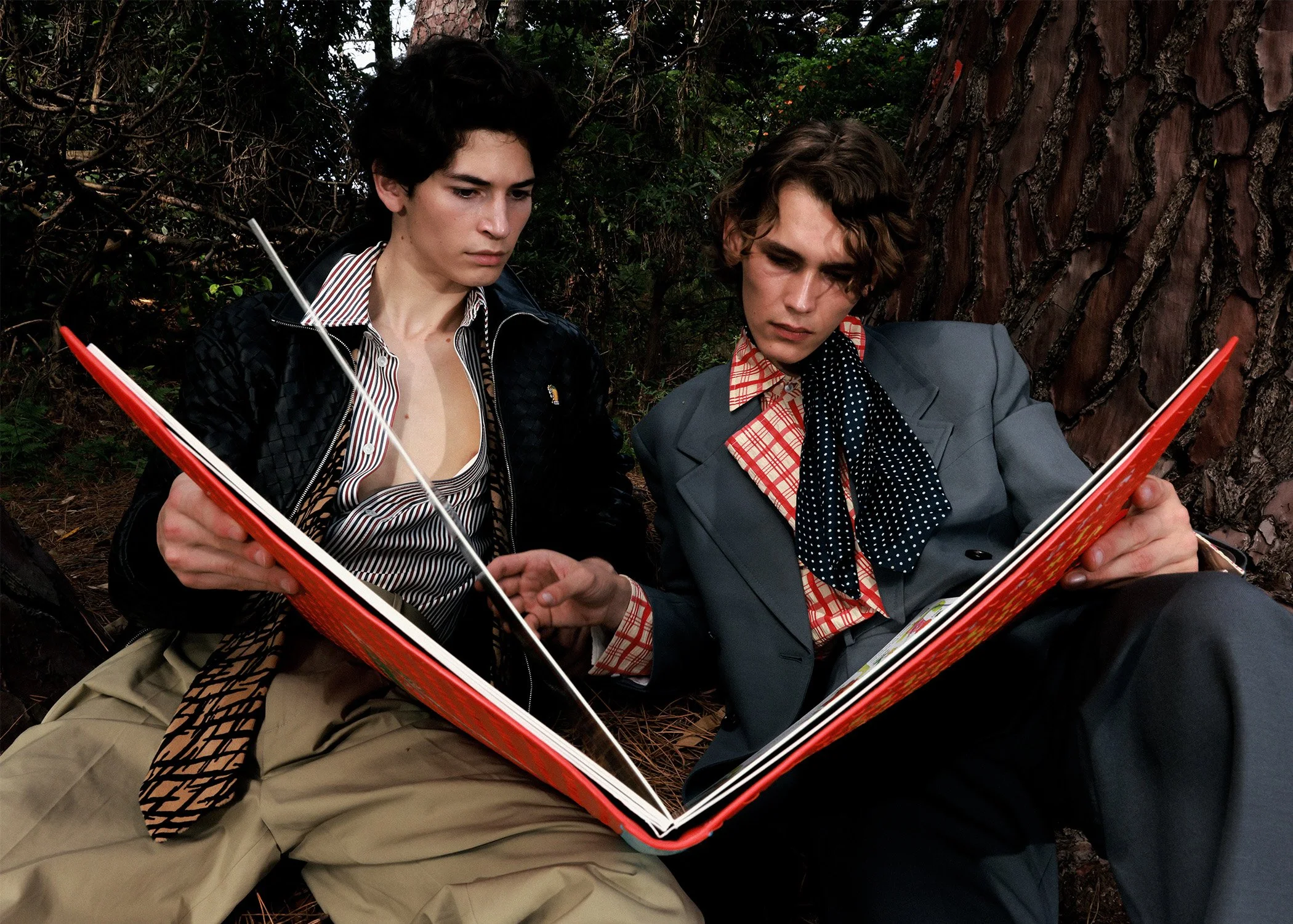 Rayan wears Bottega Veneta leather blouson, leather shirt, trouser, tie, vintage pin from Outlet Newtown. Ayden wears Bottega Veneta jacket, shirt, trouser, ‘Richard Scarry’ leather maxi book, stylist’s own scarf.