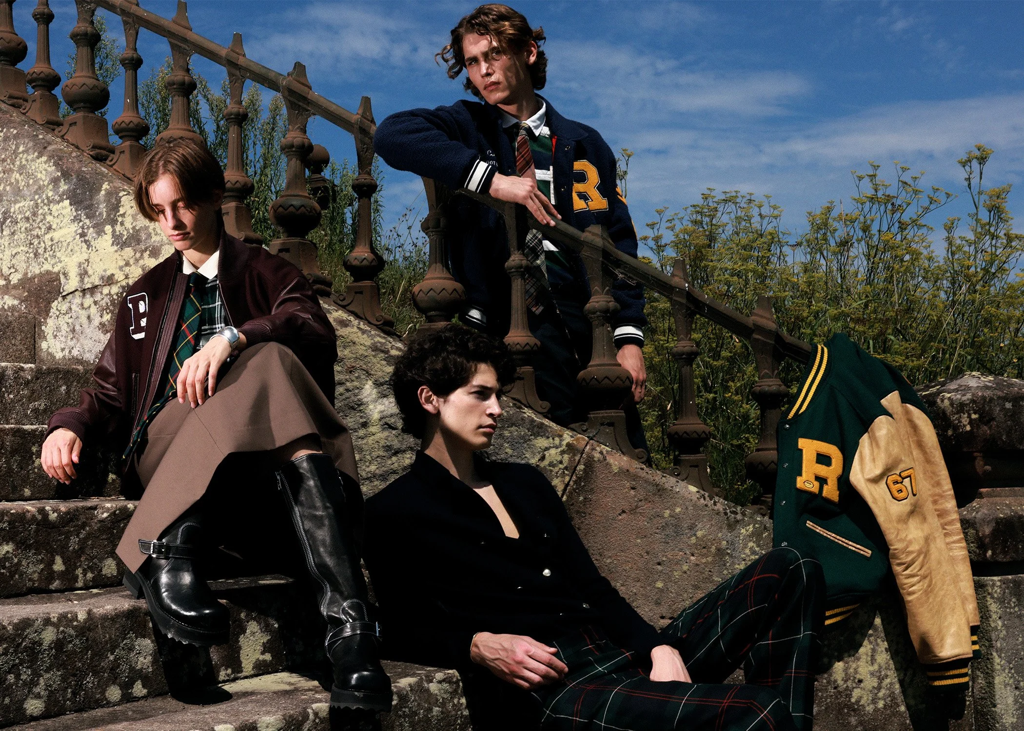 Lea wears BOSS x PORSCHE bomber jacket, Polo Ralph Lauren polo, tie, Elka Collective skirt, Tiffany & Co ‘Elsa Peretti’ small bone cuff, stylist’s own boots. Rayan wears Moncler jacket, Polo Ralph Lauren trouser, letterman jacket on stairs. Tiffany & Co ‘Tiffany Lock’ narrow bangle. Ayden wears Polo Ralph Lauren jacket, polo, tie, trouser.