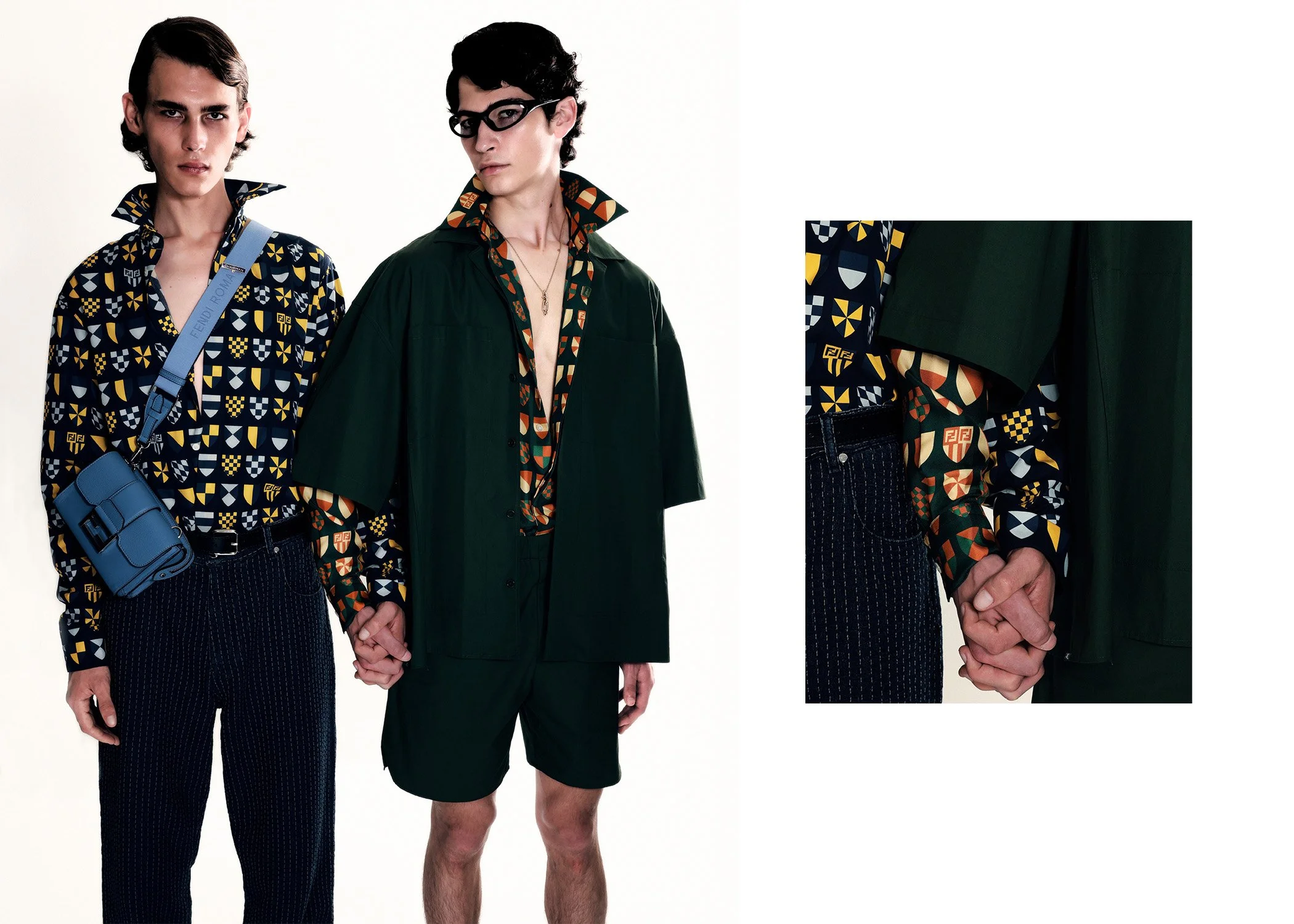 Ayden wears Fendi printed shirt, denim, Double Baguette bag, Courtney Zheng belt, vintage pin from Outlet Newtown. Rayan wears Fendi shirt, printed shirt, shorts, Gentle Monster glasses, Tiffany & Co ‘Tiffany Titan by Pharell Williams’ pendant