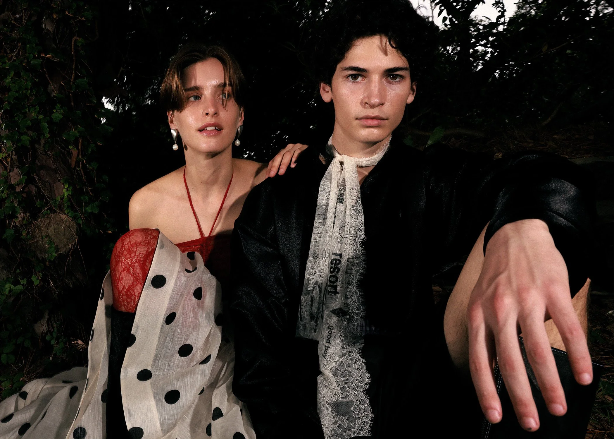 Lea wears Prada jacket, dress. Rayan wears Bottega Veneta leather blouson, leather shirt, trouser, tie, shoes, vintage pin from Outlet Newtown.