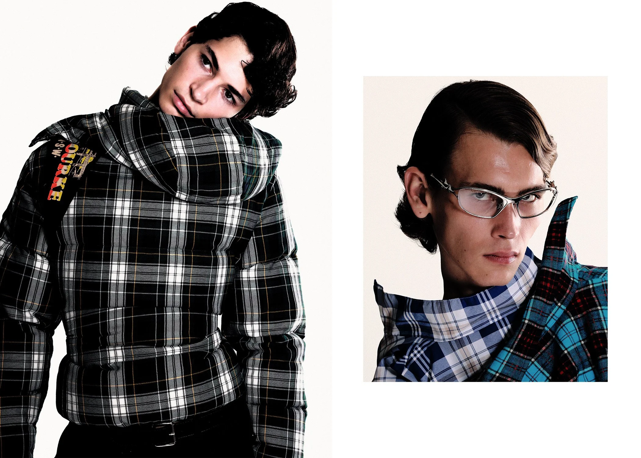 Rayan wears Polo Ralph Lauren padded jacket worn backwards, Strateas Carlucci trouser, Courtney Zheng belt, vintage flag from Outlet Newtown. Ayden wears Alix Higgins shirt, Fancy Boi top, Gentle Monster glasses