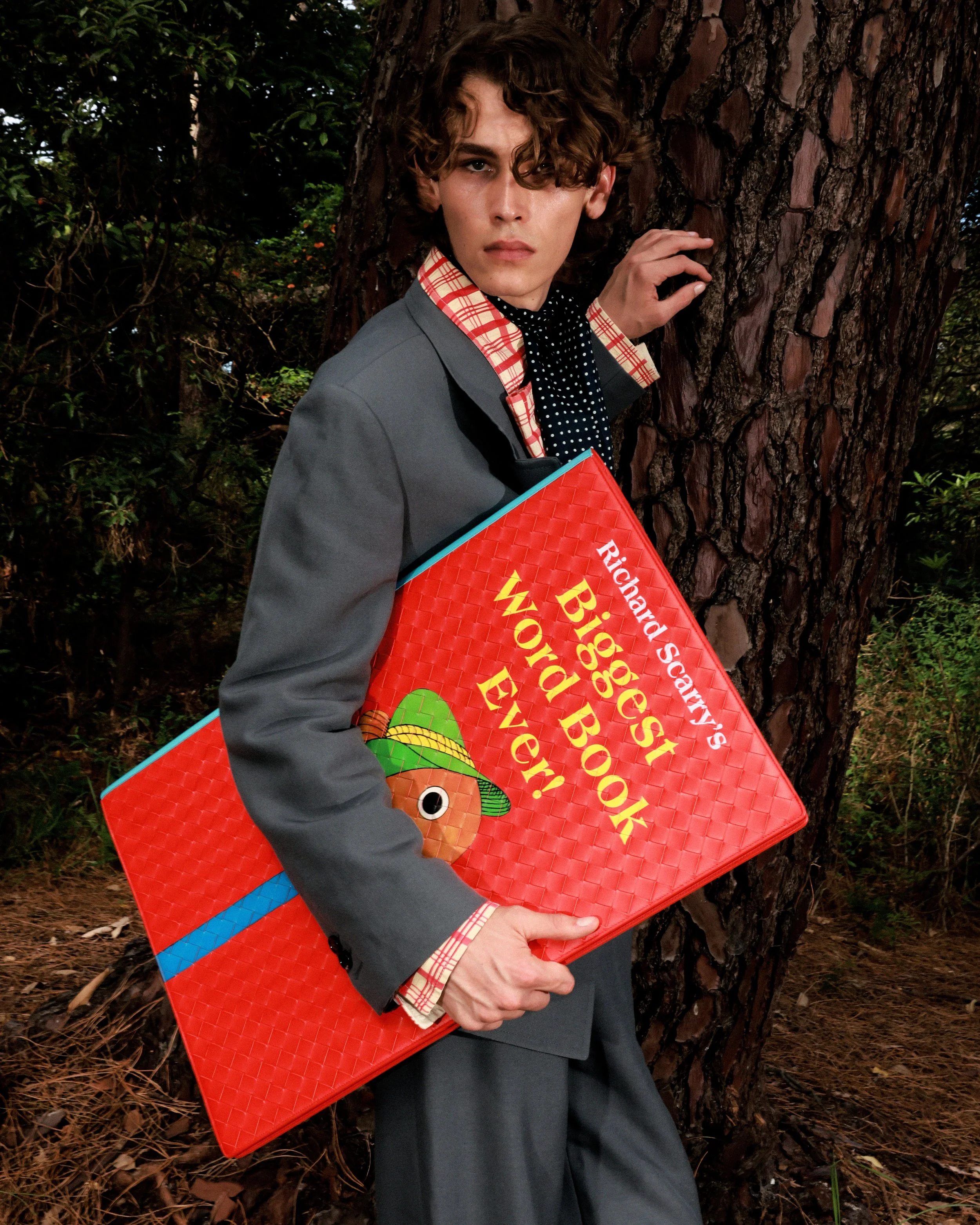 Ayden wears Bottega Veneta jacket, shirt, trouser, ‘Richard Scarry’ leather maxi book, stylist’s own scarf