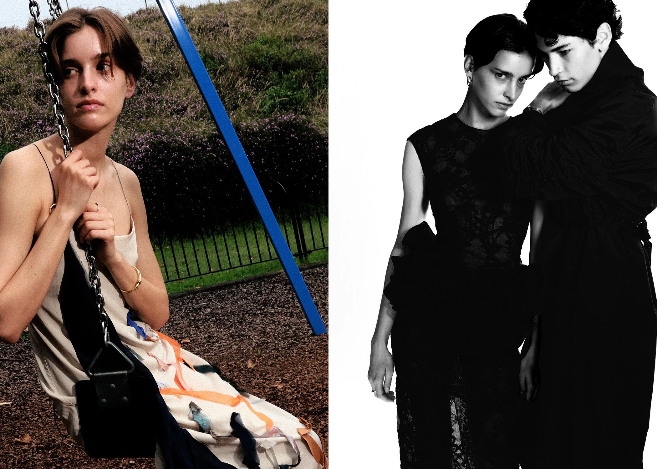 Left: Lea wears Rory William Docherty ‘painted’ dress, Tiffany & Co ‘Tiffany Knot’ bangle, ring, AGMES ‘Marta’ brooch. Right: Lea wears Zimmermann dress, Bottega Veneta earrings, Tiffany & Co ring. Rayan wears Strateas Carlucci coat, Tiffany & Co ‘Tiffany Knot’ bangle.