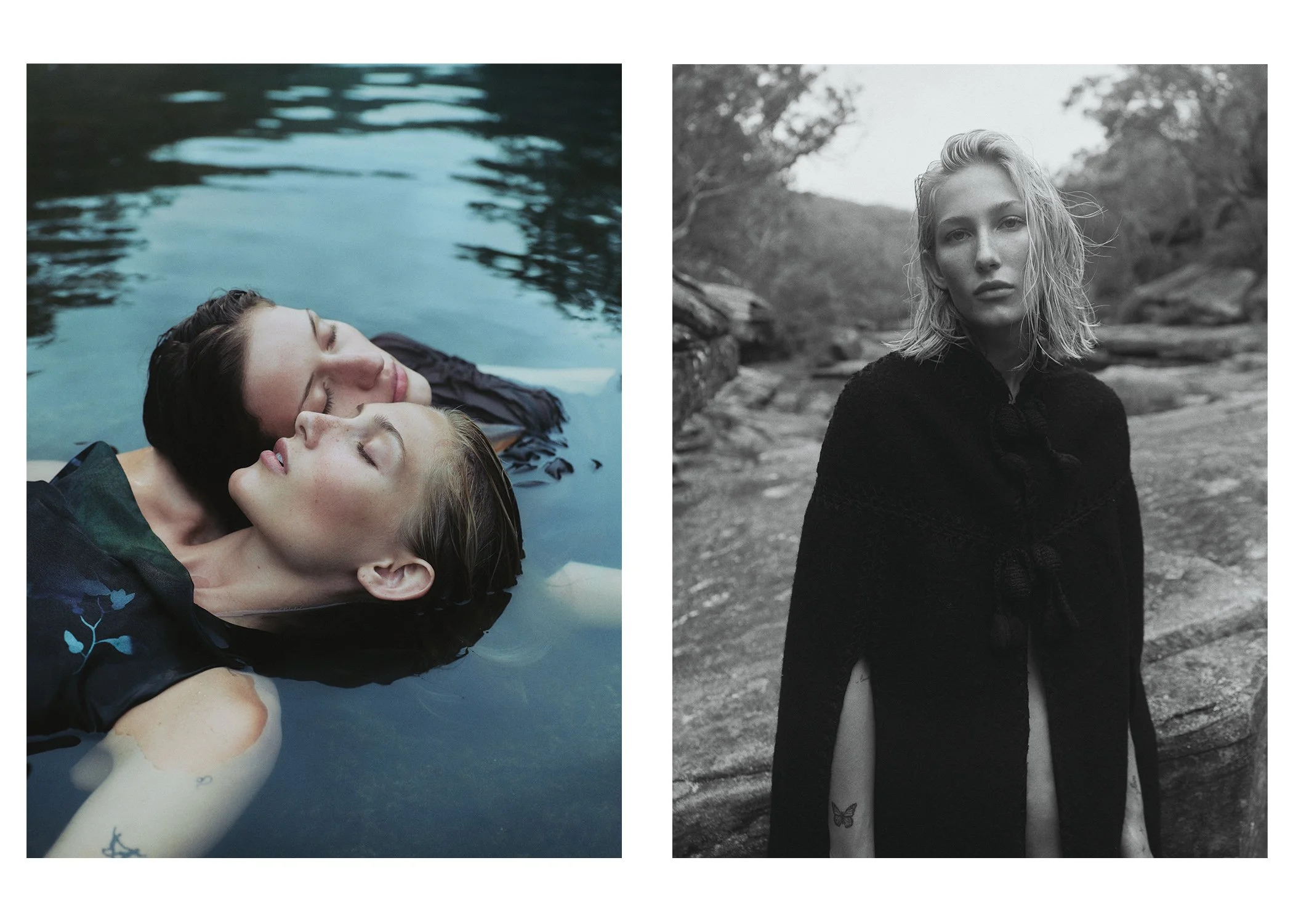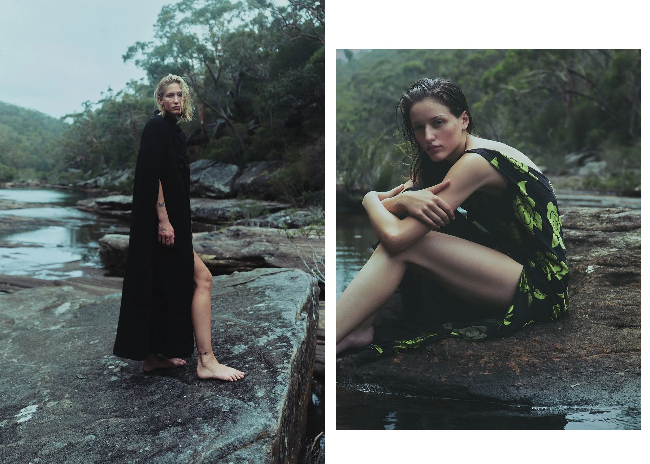 left: Jade wears Giorgio Armani dress. Sophia wears Courtney Zheng dress, stylist’s own necklace. right: vintage cape, stylist’s own