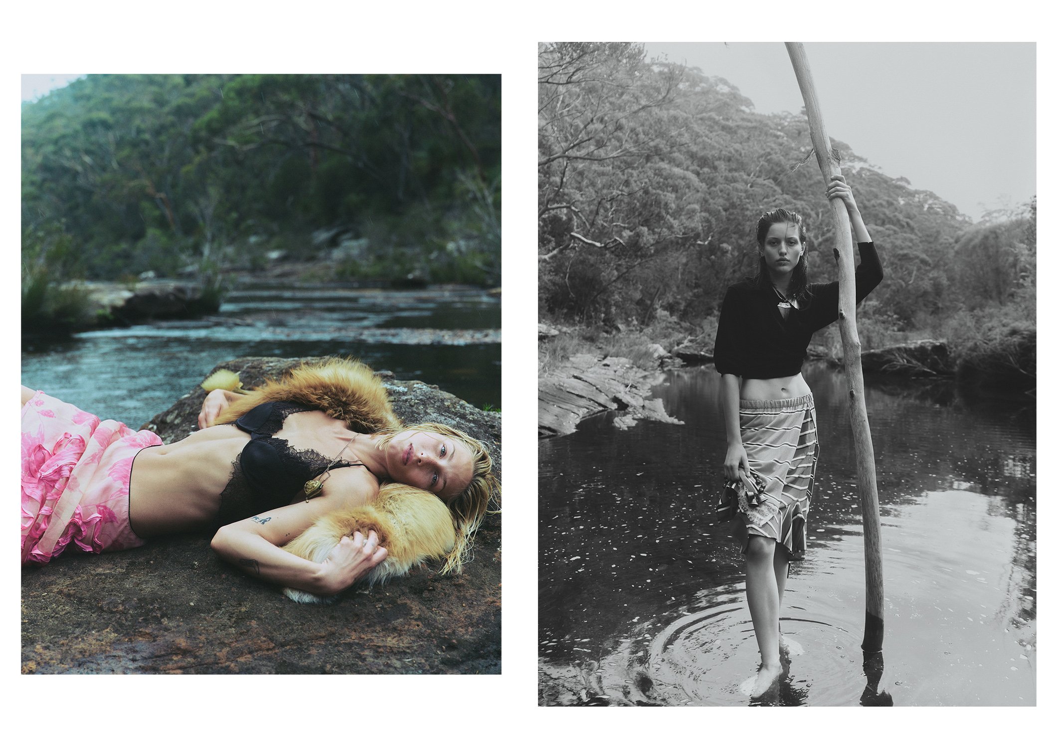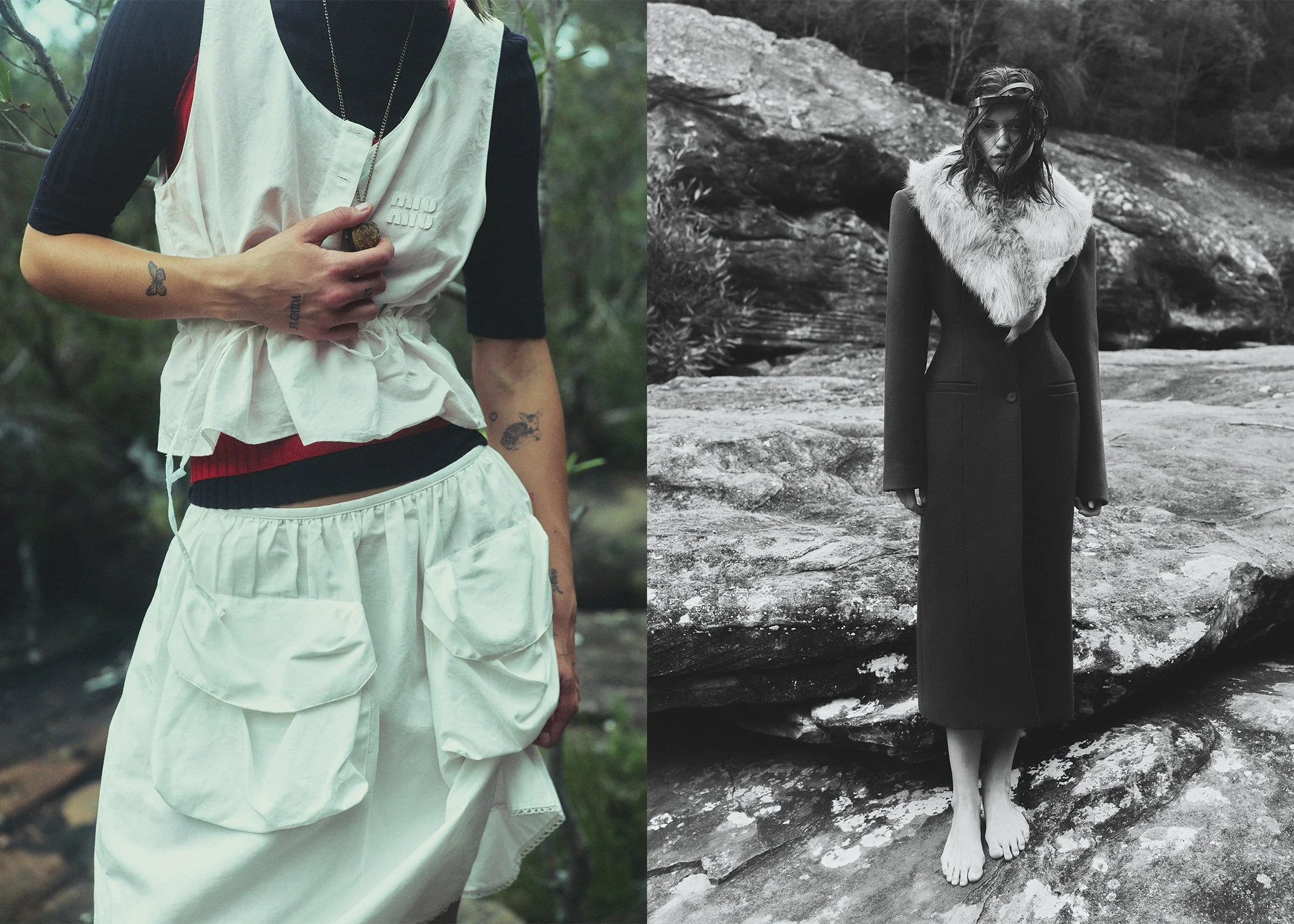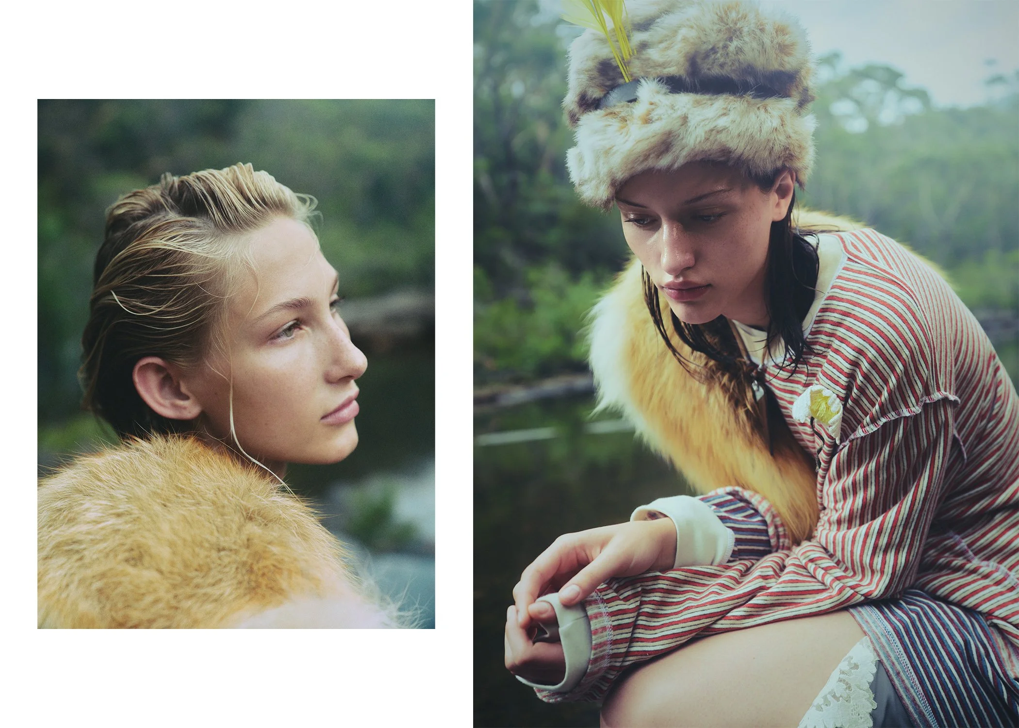 left: Jade wears Haelo bra, Lee Mathews skirt, vintage necklace, fur stole stylist’s own. right: Sophia wears Harris Tapper polo, Alix Higgins skirt, vintage necklace stylist’s own