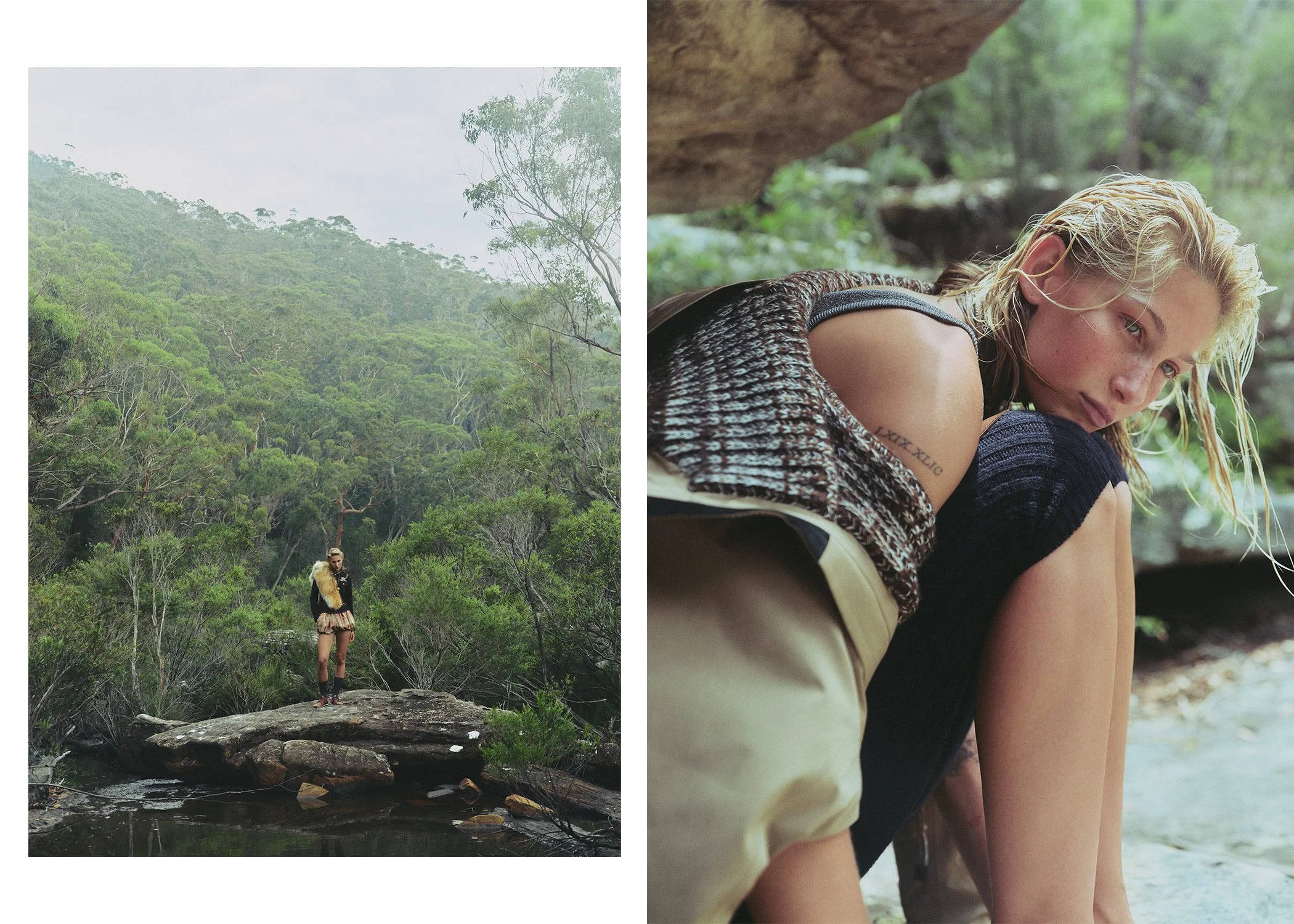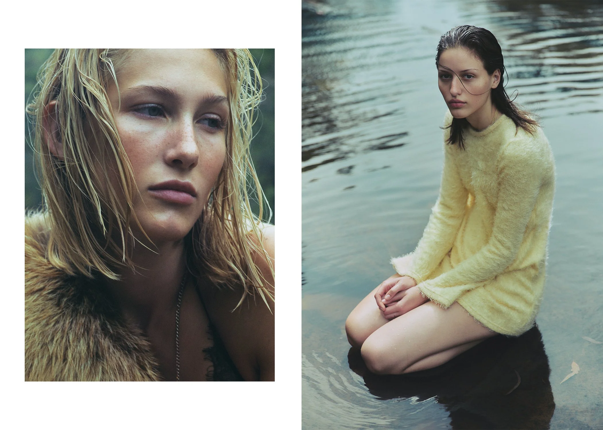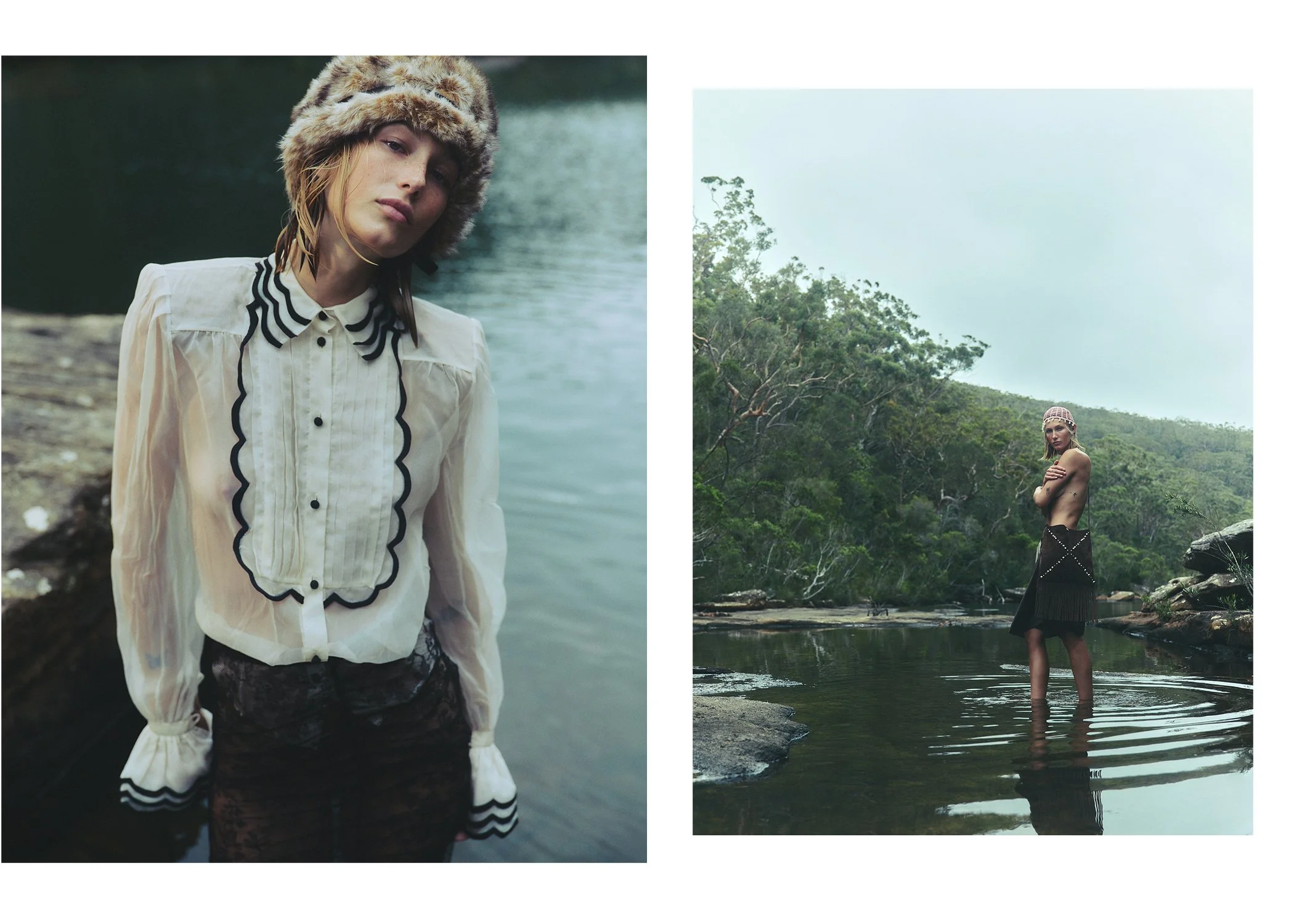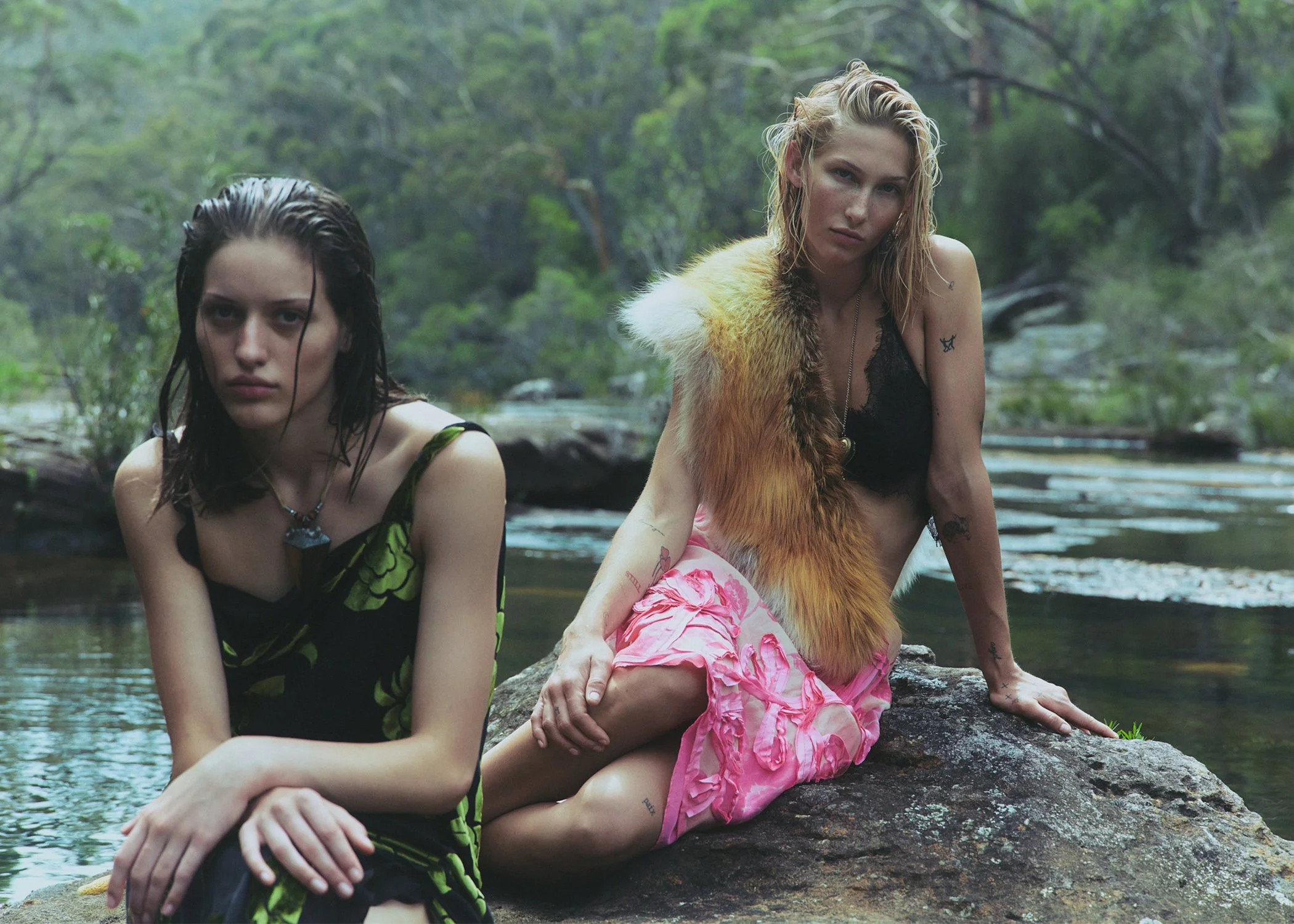 left: Jade wears Haelo bra, Lee Mathews skirt, vintage necklace, fur stole stylist’s own. right: Sophia wears Harris Tapper polo, Alix Higgins skirt, vintage necklace stylist’s own