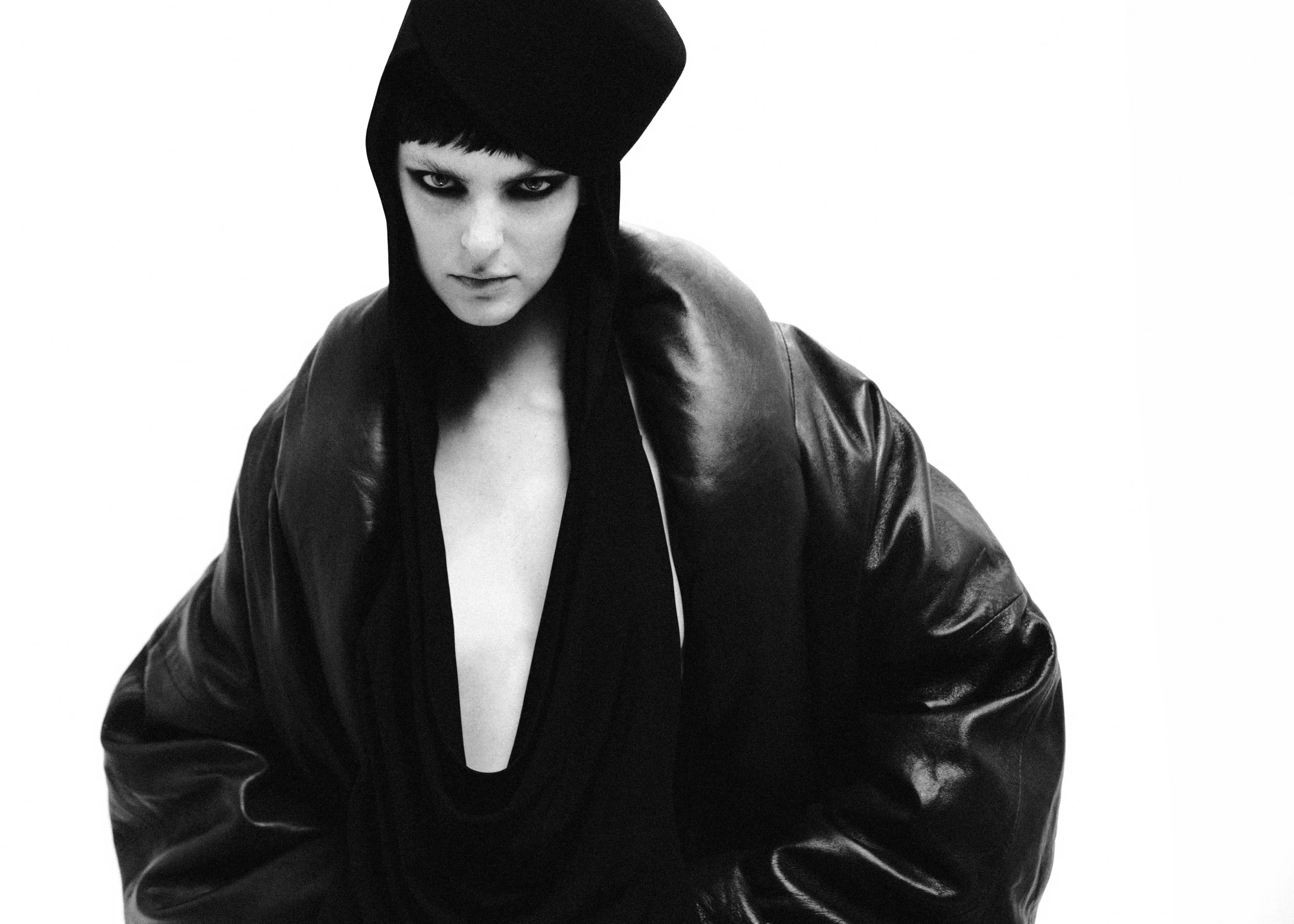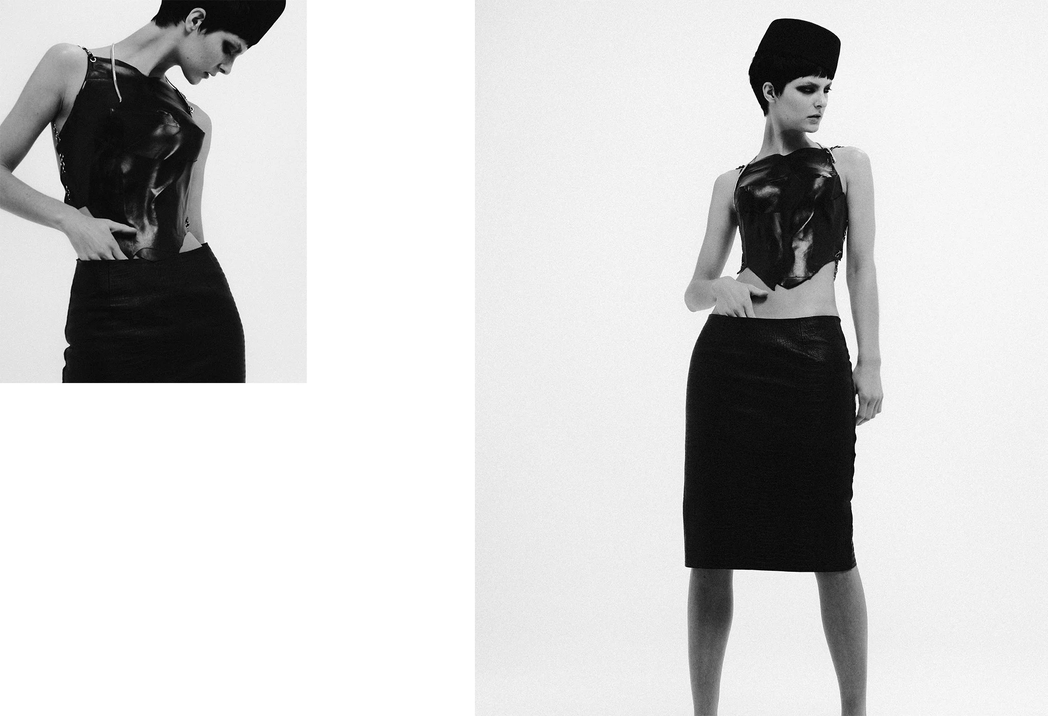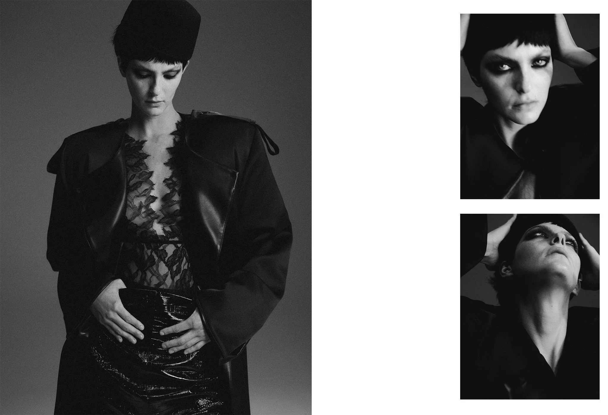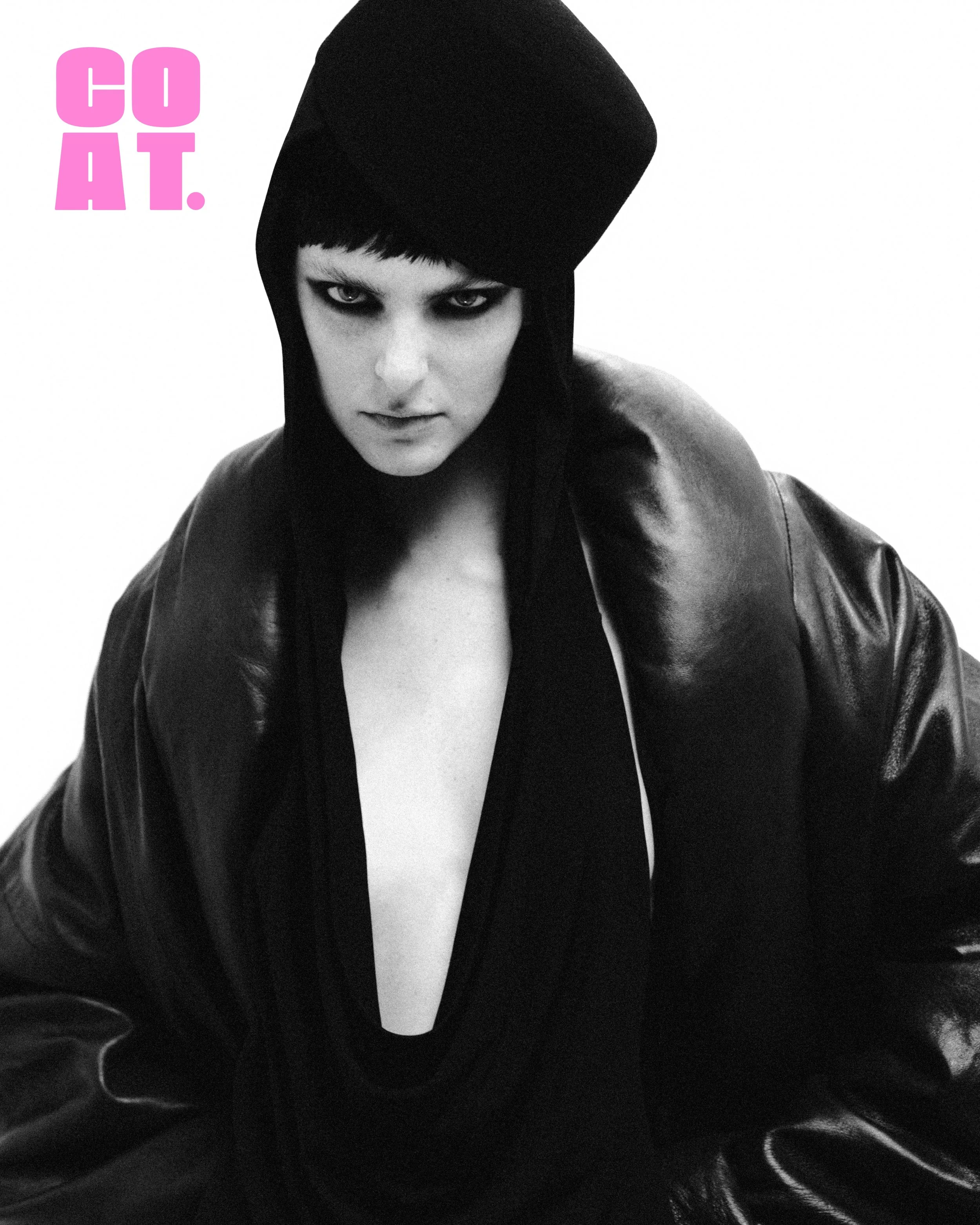 Chloe wears Esse Studios coat, bodysuit, skirt, hat stylist’s own