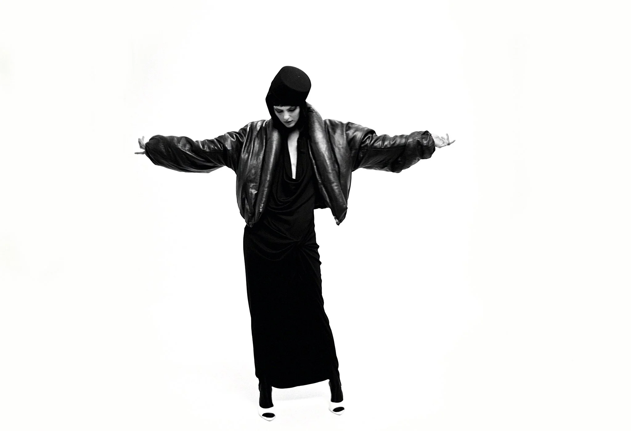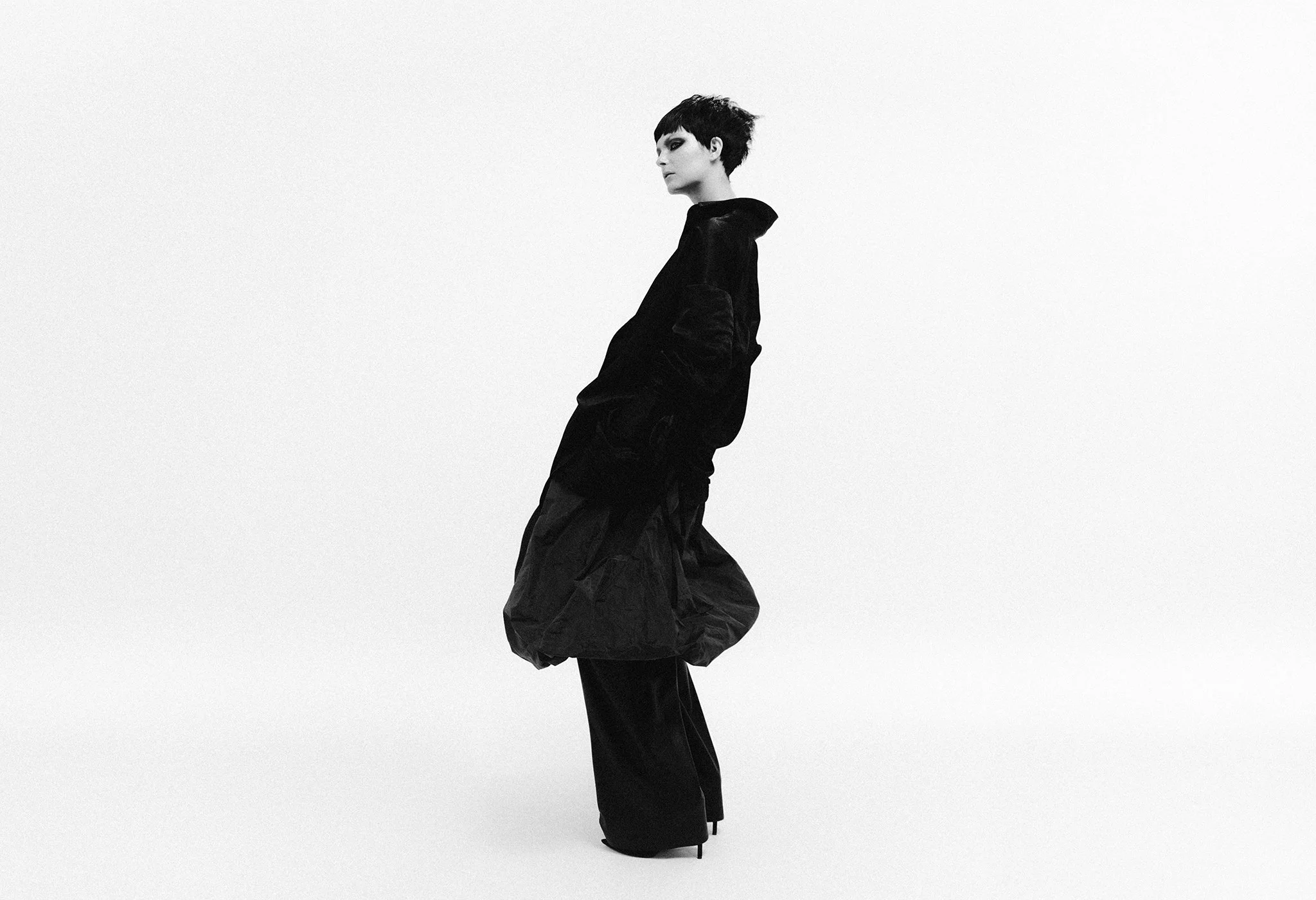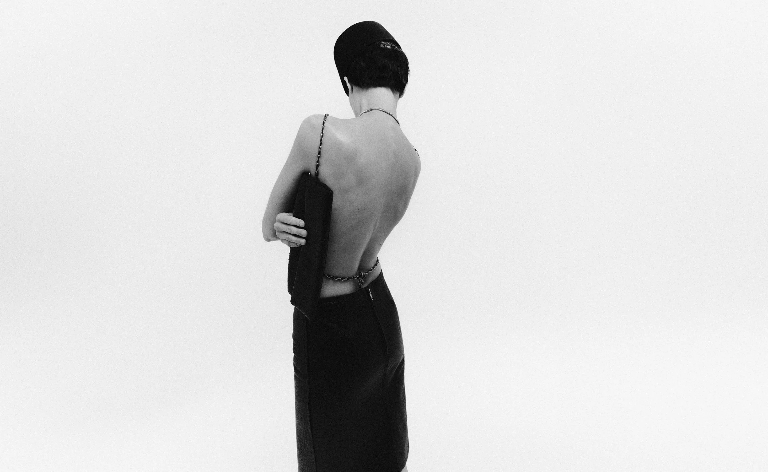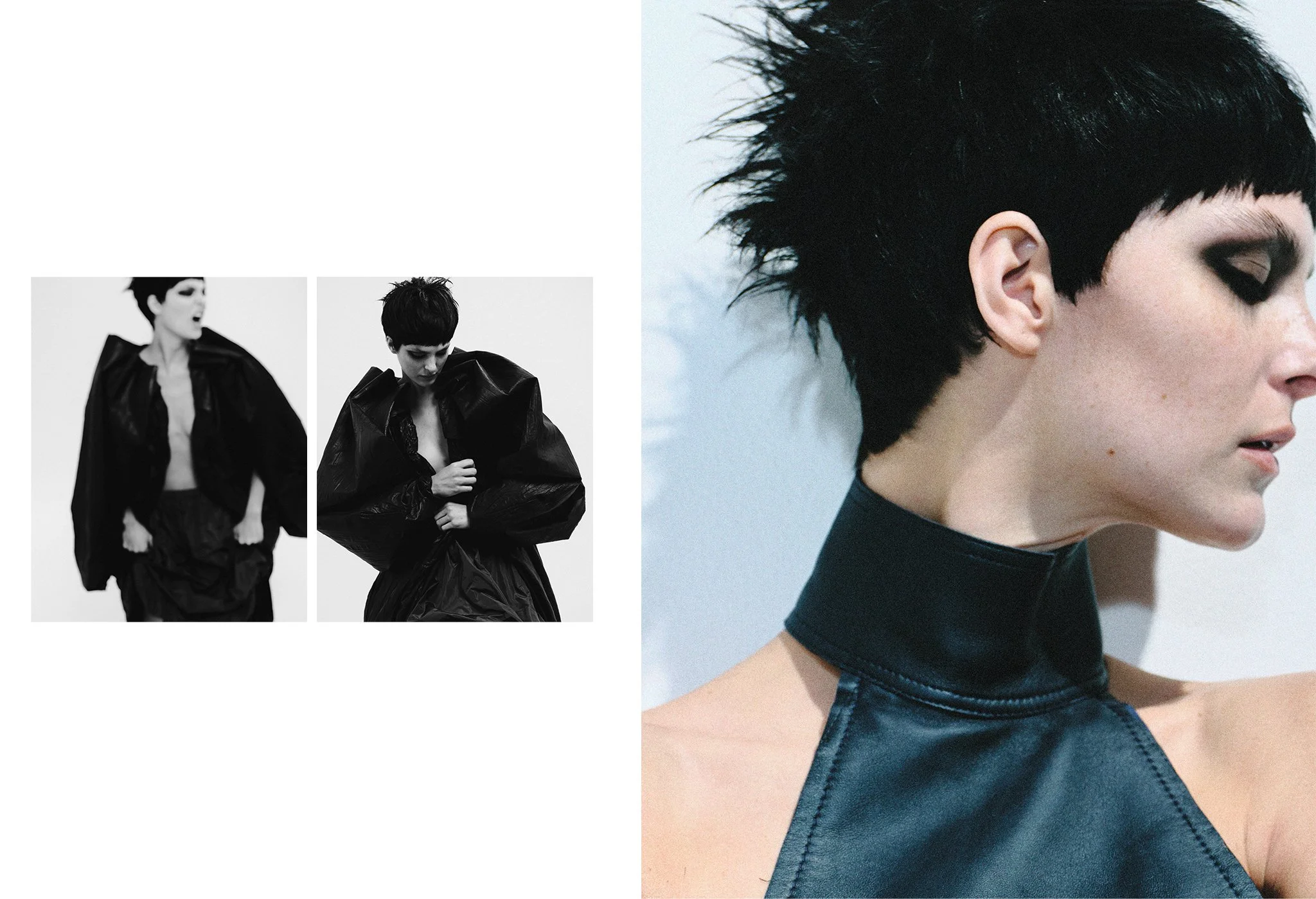 Chloe wears Esse Studios coat, bodysuit, skirt, hat stylist’s own