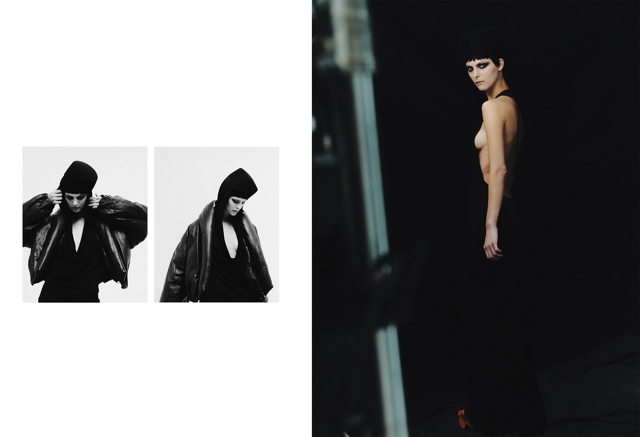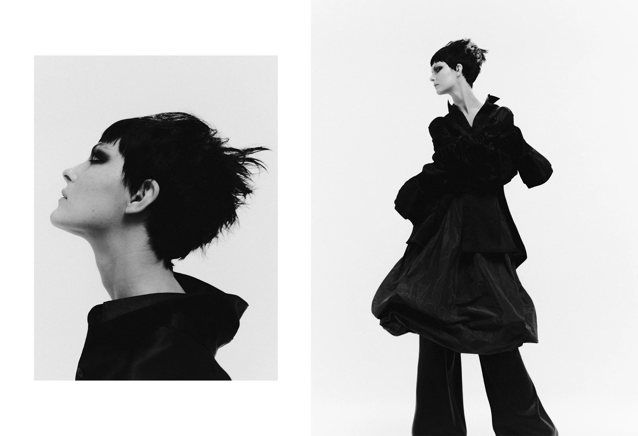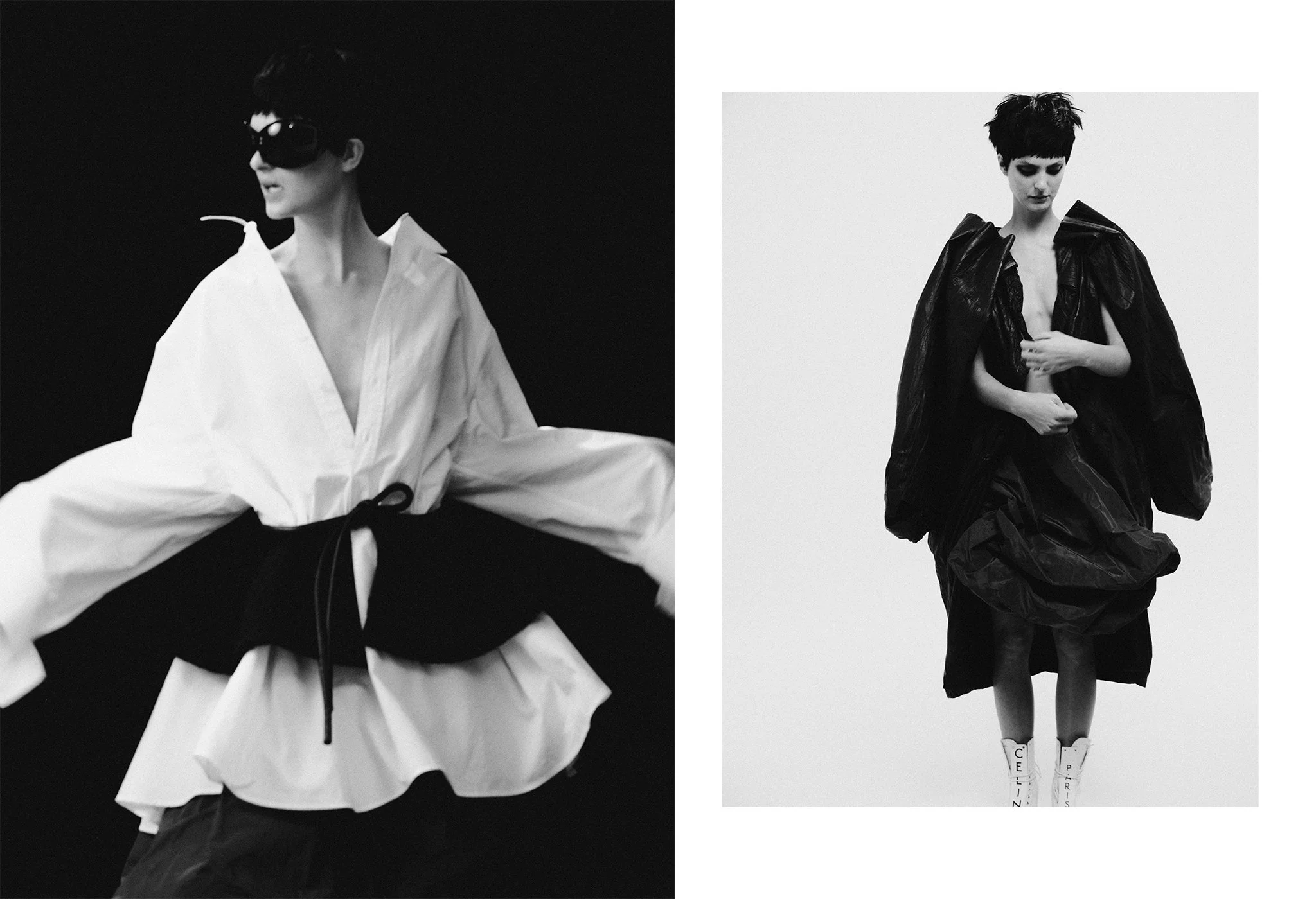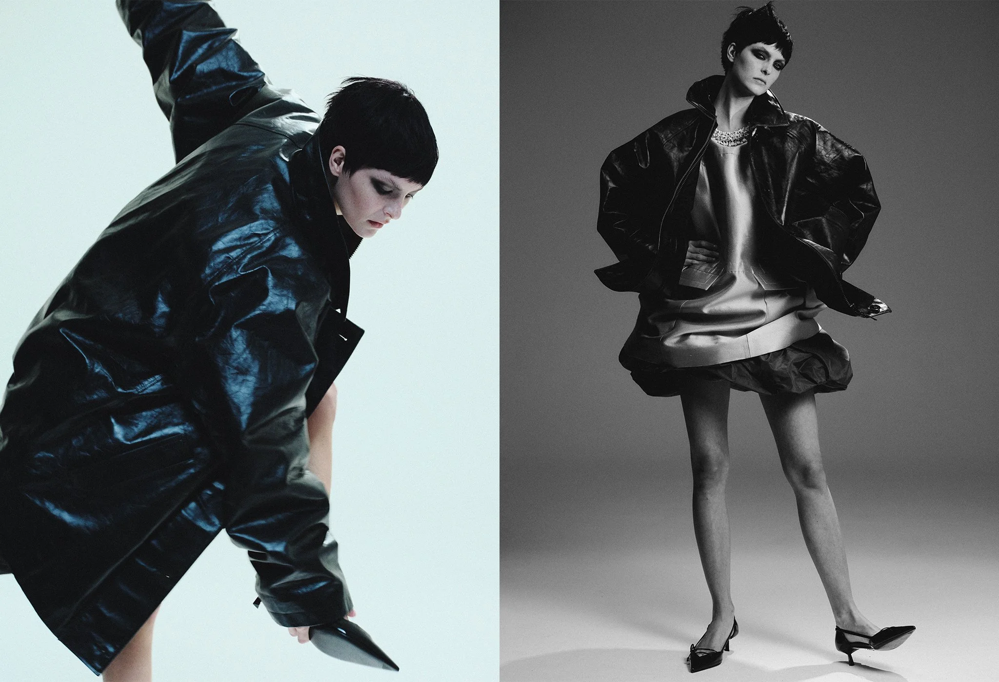left: Common Hours coat, Prada skirt, Celine boot. right: H&M Studio jacket, Haelo dress, High Heel Jungle tights, Christian Louboutin shoes, stylist’s own hat