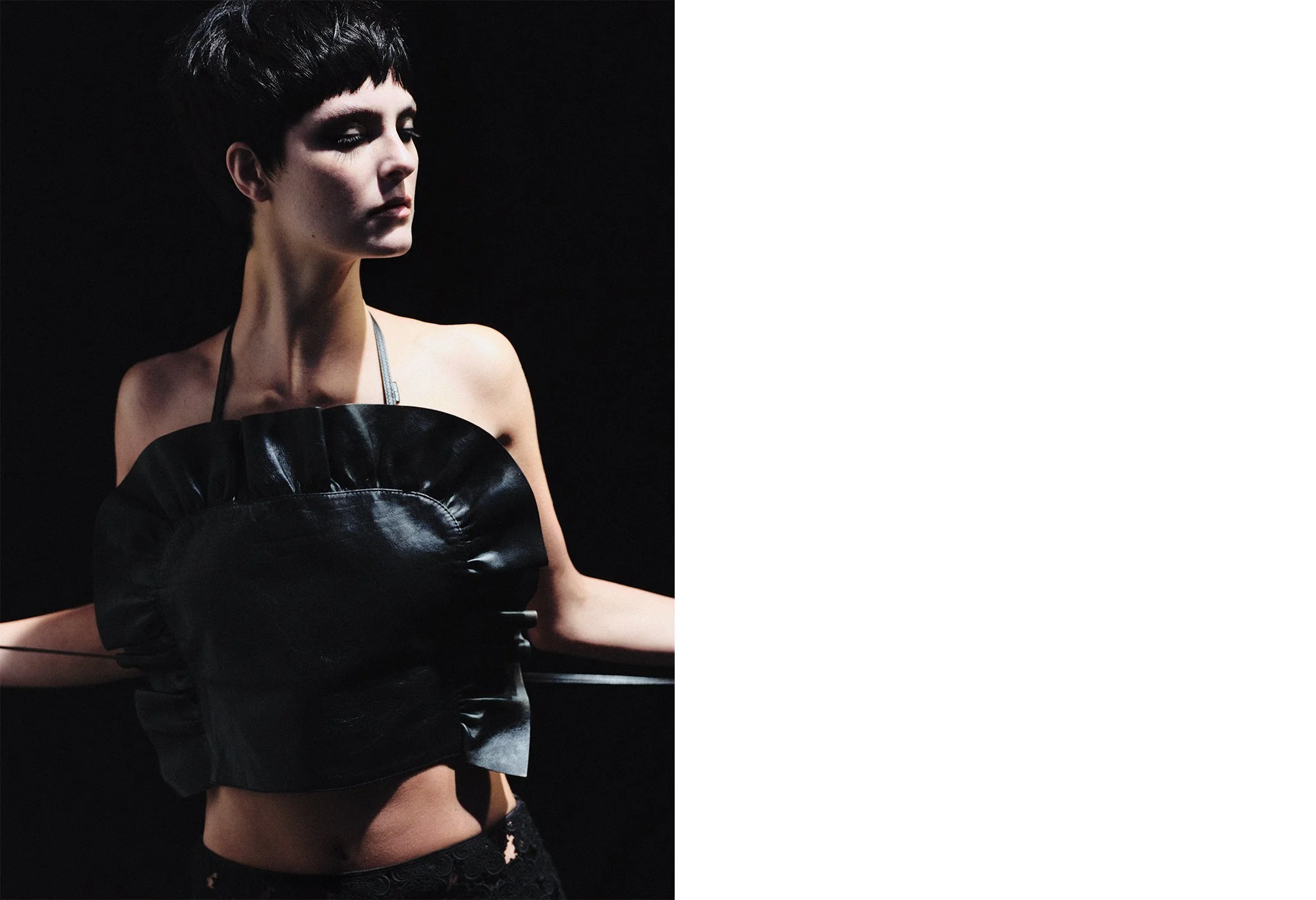 Chloe wears J.R Harvey leather top, Berkeley skirt, Bvlgari ‘Serpenti’ necklace, stylist’s own hat